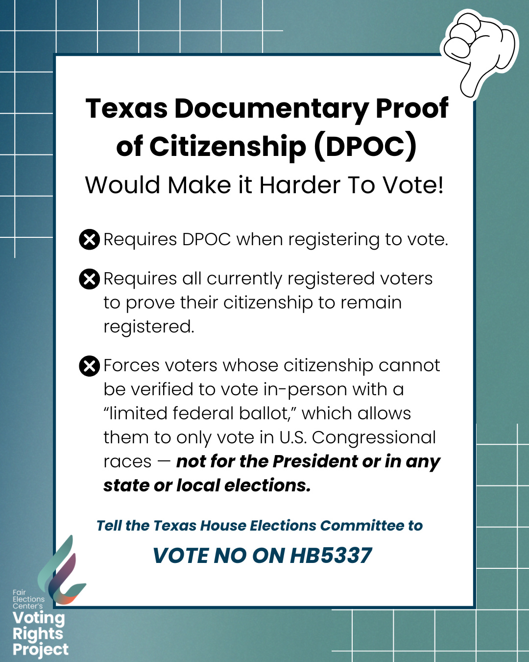 HB 5337 would impose a documentary proof of citizenship requirement to register to vote (or remain registered to vote, if voter is already registered)—even though noncitizen voting is already illegal in Texas, and data has continuously proven that noncitizen voting is not a problem in the United States.