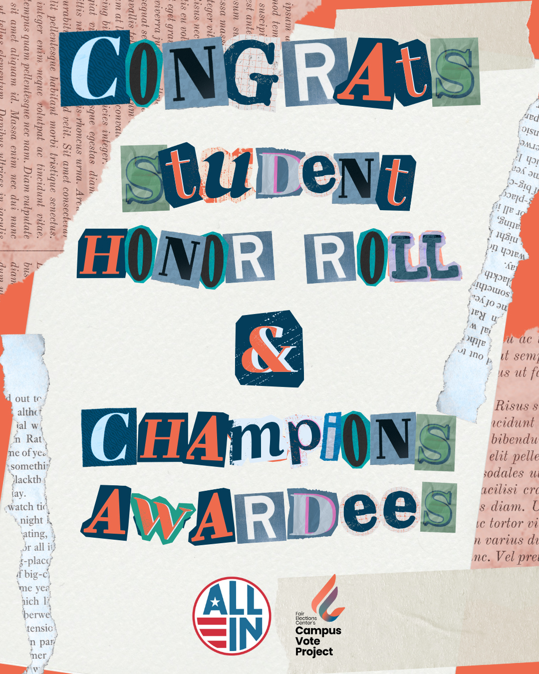 Congratulations to all the Campus Vote Project and Voter Friendly Campus students, faculty, staff, and administrators recognized as 2025 @allintovote Student Voting Honor Roll recipients and Individual Champion winners! Thank you for your hard work and commitment to nonpartisan civic and voter engagement in your campus communities.