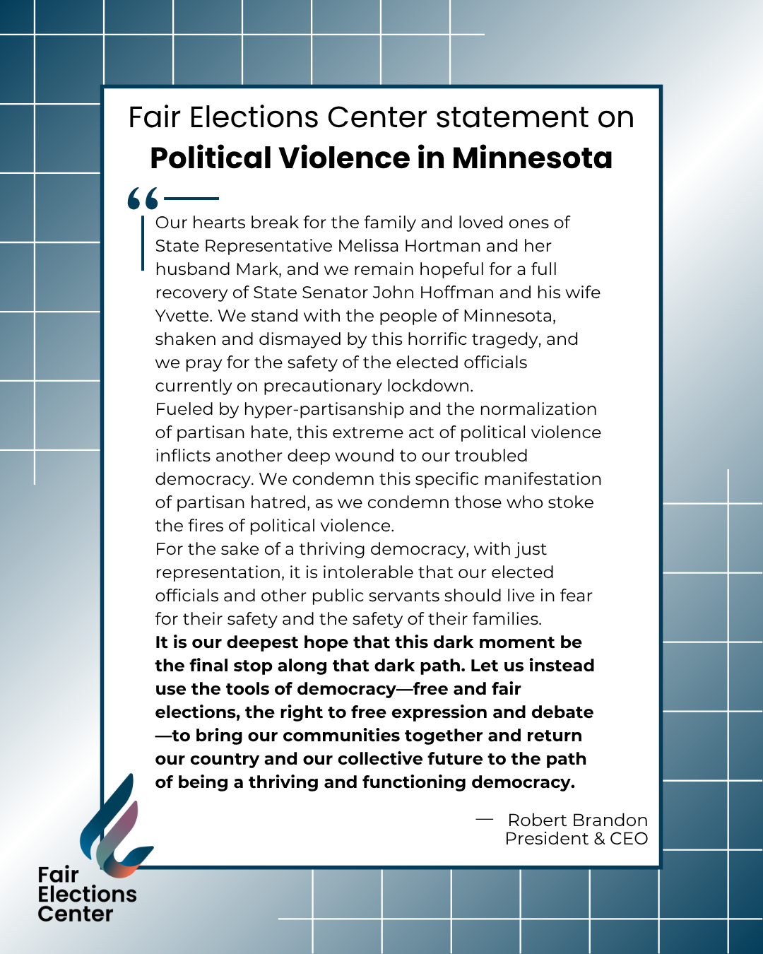 Today, Fair Elections Center released the following statement from Robert Brandon, President & CEO, on the assassination and attempted assassination of two Minnesota state legislators and their spouses in Minnesota: